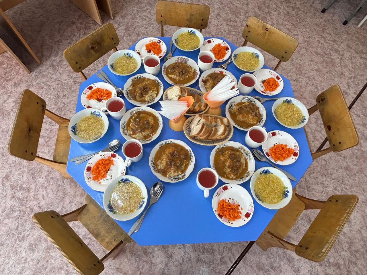 Обед: салат морковный, Щи со сметаной, полтавка с гуляшом, кисель, хлеб.