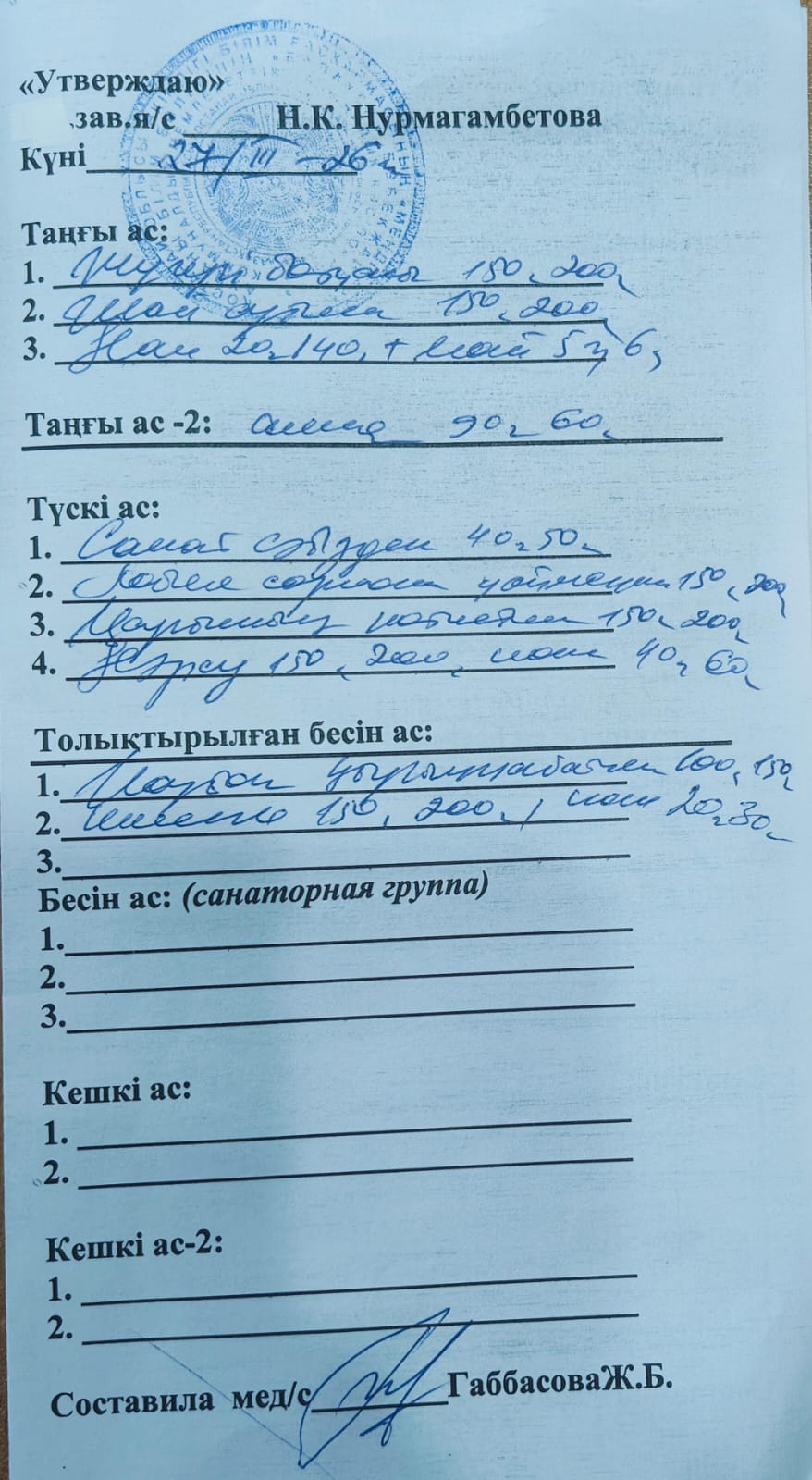 Однодневное меню на 27.03.2026 год. Завтрак: каша кукурузная, чай с молоком, батон с маслом. Второй завтрак: яблоко. Обед: салат морковный, суп с фасолью, гречка с котлетой, кампот, хлеб. Усиленный ужин: капуста с картошкой, кисель, хлеб.